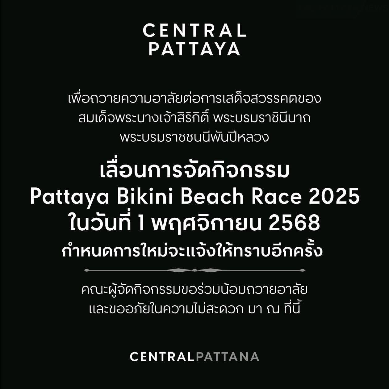 Central Pattaya ขอแจ้งข่าวสำคัญเกี่ยวกับการจัดงาน Pattaya International Bikini Beach Race 2025 ที่เดิมทีวางแผนไว้ในวันที่ 1 พฤศจิกายน 2025 โดยในโอกาสอันสำคัญซึ่งเป็นการไว้อาลัยแด่พระมหากษัตริย์หญิง สมเด็จพระบรมราชชนนีพันปีหลวง (สมเด็จพระราชินีศิริกิติ์) ในโอกาสวันสวรรคตของพระองค์ ท่านผู้จัดงานจึงมีความจำเป็นต้องเลื่อนวันจัดกิจกรรมนี้ออกไปก่อน และจะมีการประกาศวันจัดงานใหม่อีกครั้งในภายหลัง